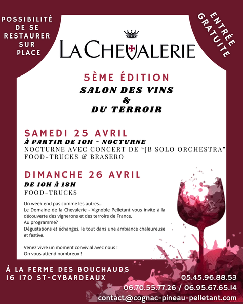 samedi 25 avril et dimanche 26 avril, le Salon des Vins & du Terroir organisé par l'équipe du Domaine de la Chevalerie - Vignoble Pelletant fait son retour pour sa 5ème édition à la ferme des Bouchauds ! Entrée libre